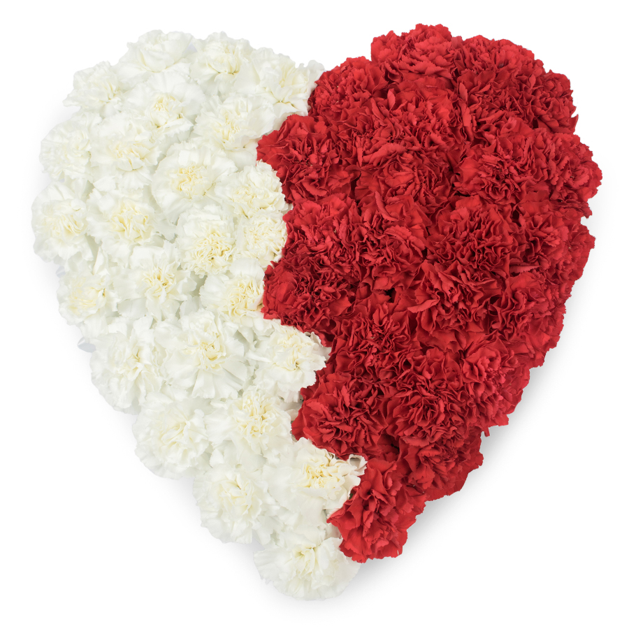 Handy Flowers presents the Luxurious Mixed Carnations Heart, a stunning arrangement featuring white and red carnations that beautifully express sympathy and love.